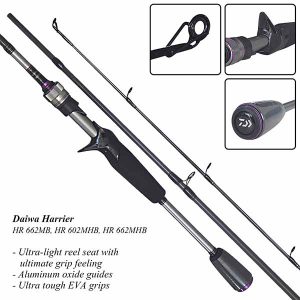Joran Daiwa Harrier 2017 hadir dengan desain baru yang lebih menarik dengan perpaduan warna. Terbuat dari bahan graphite blank yang sensitif dengan karbon fiber blank HVF dilengkapi dengan X45, V-Joint dan Micro Pitch. Pada bagian ring menggunakan zirconia dan Kustom Grip EVA Split by Daiwa S.E.A.
