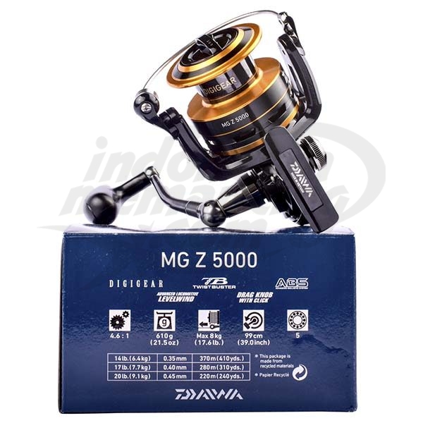 Daiwa MG Z, reel pancing berbahan aluminium didukung 5 ball bearing dan 1 roller bearing yang dirancang kuat, awet, dan tahan lama. Ideal untuk melengkapi peralatan memancing Anda.