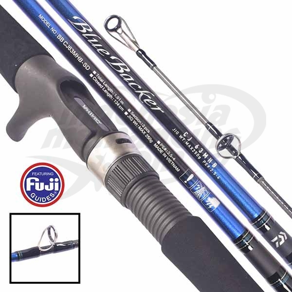 Joran Daiwa Blue Backer CJ ini dengan desain warna biru dan hitam, model sambung 2 bagian butt. Terbuat dari karbon blank HVF dan temodifikasi micro pitch taping blank. Dilengkapi ring guide yang sudah Fuji dan Pegangan EVA Ultra Tough membuat tampilannya lebih menarik. Tersedia model spinning dan overhead, cocok digunakan untuk mancing cast-jig, atau dasaran.
