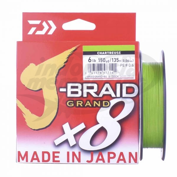 Produk terbaru daiwa keluaran varian J-Braid Grand X8 panjang 135m, Daiwa J-Braid Grand hadir dengan teknologi braided X8, menjadikannya lebih halus dan lebih kuat. bisa di gunakan untuk mancing casting/sungai/laut. Tersedia dalam 4 warna: chartreuse, dark green, gray light dan island blue.