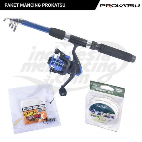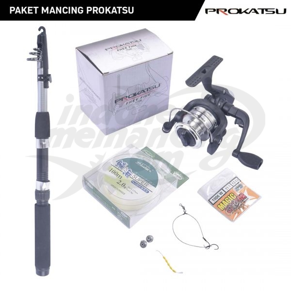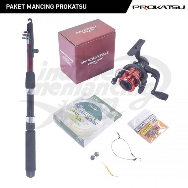 Paket mancing Murah Prokatsu Free Fire, bisa di gunakan untuk mancing di kolam/empang/sungai/rawa. Joran berbahan Fiber, Reel bahan graphite. Tersedia 4 pilihan warna : Red, Blue, Silver dan Gold.